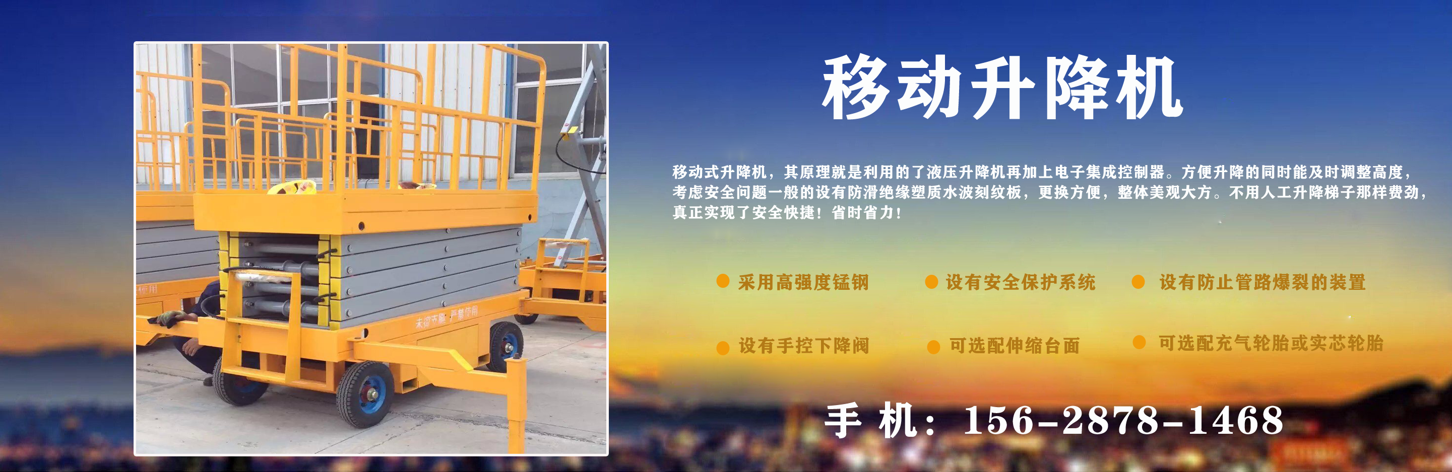 濟(jì)南中升機(jī)械制造有限公司主營移動(dòng)升降機(jī),小型移動(dòng)升降機(jī),移動(dòng)式升降機(jī),移動(dòng)剪叉升降機(jī),移動(dòng)剪叉式升降機(jī)等產(chǎn)品,信譽(yù)良好,歡迎前來咨詢訂購!  在銷售上,尊重每一個(gè)客戶,做到保質(zhì)、保量及時(shí)供貨;在售后服務(wù)上,以較短的時(shí)間,用較快的速度解決,終身追蹤服務(wù)。  公司始終以“品質(zhì)為本,服務(wù)至上”為公司宗旨。致力于提供高品質(zhì)的產(chǎn)品,完善的服務(wù),快捷的供貨,無論您身處何方,都能感受到我們的優(yōu)良服務(wù)。客戶至上,誠信為本。  歡迎各界朋友來電,來函垂詢,選購!...